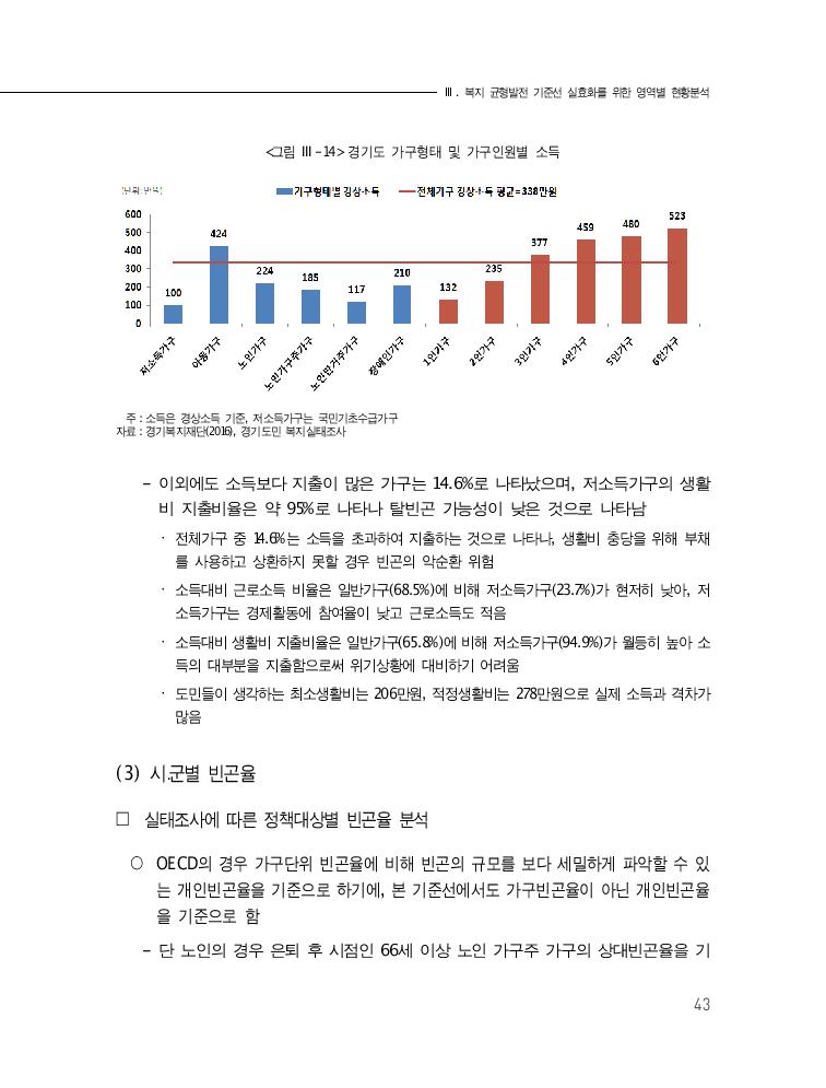 Ⅲ. 복지 균형발전 기준선 실효화를 위한 영역별 현황분석 43 <그림 Ⅲ-14> 경기도 가구형태 및 가구인원별 소득 주:소득은 경상소득 기준, 저소득가구는 국민기초수급가구 자료:경기복지재단(2016), 경기도민 복지실태조사 - 이외에도 소득보다 지출이 많은 가구는 14.6%로 나타났으며, 저소득가구의 생활 비 지출비율은 약 95%로 나타나 탈빈곤 가능성이 낮은 것으로 나타남 ・ 전체가구 중 14.6%는 소득을 초과하여 지출하는 것으로 나타나, 생활비 충당을 위해 부채 를 사용하고 상환하지 못할 경우 빈곤의 악순환 위험 ・ 소득대비 근로소득 비율은 일반가구(68.5%)에 비해 저소득가구(23.7%)가 현저히 낮아, 저 소득가구는 경제활동에 참여율이 낮고 근로소득도 적음 ・ 소득대비 생활비 지출비율은 일반가구(65.8%)에 비해 저소득가구(94.9%)가 월등히 높아 소 득의 대부분을 지출함으로써 위기상황에 대비하기 어려움 ・ 도민들이 생각하는 최소생활비는 206만원, 적정생활비는 278만원으로 실제 소득과 격차가 많음 (3) 시․군별 빈곤율 □ 실태조사에 따른 정책대상별 빈곤율 분석 ○ OECD의 경우 가구단위 빈곤율에 비해 빈곤의 규모를 보다 세밀하게 파악할 수 있 는 개인빈곤율을 기준으로 하기에, 본 기준선에서도 가구빈곤율이 아닌 개인빈곤율 을 기준으로 함 - 단 노인의 경우 은퇴 후 시점인 66세 이상 노인 가구주 가구의 상대빈곤율을 기