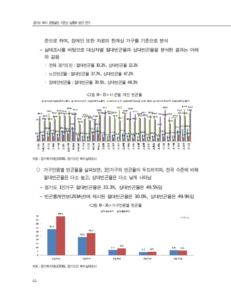 경기도 복지 균형발전 기준선 실효화 방안 연구 44 준으로 하며, 장애인 또한 자료의 한계상 가구를 기준으로 분석 - 실태조사를 바탕으로 대상자별 절대빈곤율과 상대빈곤율을 분석한 결과는 아래 와 같음 ・ 전체 경기도민:절대빈곤율 10.2%, 상대빈곤율 12.2% ・ 노인빈곤율:절대빈곤율 37.7%, 상대빈곤율 47.2% ・ 장애인빈곤율:절대빈곤율 39.5%, 상대빈곤율 48.3% <그림 Ⅲ-15> 시·군별 개인 빈곤율 자료:경기복지재단(2016), 경기도민 복지실태조사 ○ 가구인원별 빈곤율을 살펴보면, 1인가구의 빈곤율이 두드러지며, 전국 수준에 비해 절대빈곤율은 다소 높고, 상대빈곤율은 다소 낮게 나타남 - 경기도 1인가구 절대빈곤율은 33.3%, 상대빈곤율은 49.5%임 - 빈곤통계연보(2014년)에 제시된 절대빈곤율은 30.0%, 상대빈곤율은 49.9%임 <그림 Ⅲ-16> 가구인원별 빈곤율 자료:경기복지재단(2016), 경기도민 복지실태조사
