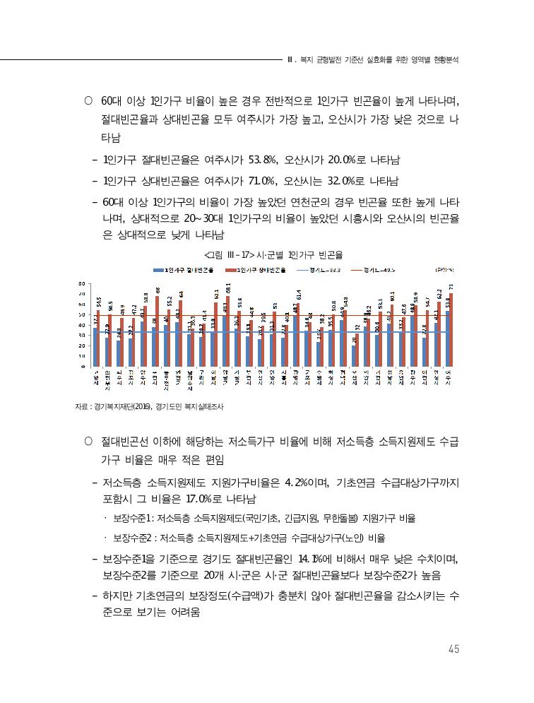 Ⅲ. 복지 균형발전 기준선 실효화를 위한 영역별 현황분석 45 ○ 60대 이상 1인가구 비율이 높은 경우 전반적으로 1인가구 빈곤율이 높게 나타나며, 절대빈곤율과 상대빈곤율 모두 여주시가 가장 높고, 오산시가 가장 낮은 것으로 나 타남 - 1인가구 절대빈곤율은 여주시가 53.8%, 오산시가 20.0%로 나타남 - 1인가구 상대빈곤율은 여주시가 71.0%, 오산시는 32.0%로 나타남 - 60대 이상 1인가구의 비율이 가장 높았던 연천군의 경우 빈곤율 또한 높게 나타 나며, 상대적으로 20~30대 1인가구의 비율이 높았던 시흥시와 오산시의 빈곤율 은 상대적으로 낮게 나타남 <그림 Ⅲ-17> 시·군별 1인가구 빈곤율 자료:경기복지재단(2016), 경기도민 복지실태조사 ○ 절대빈곤선 이하에 해당하는 저소득가구 비율에 비해 저소득층 소득지원제도 수급 가구 비율은 매우 적은 편임 - 저소득층 소득지원제도 지원가구비율은 4.2%이며, 기초연금 수급대상가구까지 포함시 그 비율은 17.0%로 나타남 ・ 보장수준1:저소득층 소득지원제도(국민기초, 긴급지원, 무한돌봄) 지원가구 비율 ・ 보장수준2:저소득층 소득지원제도+기초연금 수급대상가구(노인) 비율 - 보장수준1을 기준으로 경기도 절대빈곤율인 14.1%에 비해서 매우 낮은 수치이며, 보장수준2를 기준으로 20개 시·군은 시·군 절대빈곤율보다 보장수준2가 높음 - 하지만 기초연금의 보장정도(수급액)가 충분치 않아 절대빈곤율을 감소시키는 수 준으로 보기는 어려움