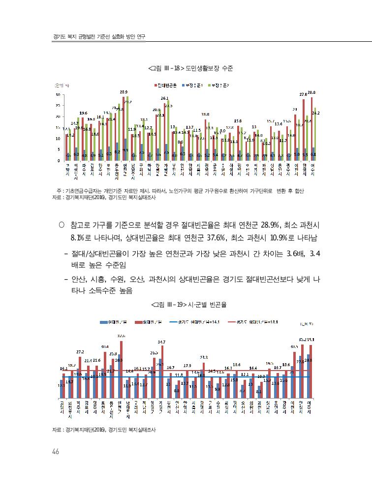 경기도 복지 균형발전 기준선 실효화 방안 연구 46 <그림 Ⅲ-18> 도민생활보장 수준 주:기초연금수급자는 개인기준 자료만 제시. 따라서, 노인가구의 평균 가구원수로 환산하여 가구단위로 변환 후 합산 자료:경기복지재단(2016), 경기도민 복지실태조사 ○ 참고로 가구를 기준으로 분석할 경우 절대빈곤율은 최대 연천군 28.9%, 최소 과천시 8.1%로 나타나며, 상대빈곤율은 최대 연천군 37.6%, 최소 과천시 10.9%로 나타남 - 절대/상대빈곤율이 가장 높은 연천군과 가장 낮은 과천시 간 차이는 3.6배, 3.4 배로 높은 수준임 - 안산, 시흥, 수원, 오산, 과천시의 상대빈곤율은 경기도 절대빈곤선보다 낮게 나 타나 소득수준 높음 <그림 Ⅲ-19> 시·군별 빈곤율 자료:경기복지재단(2016), 경기도민 복지실태조사