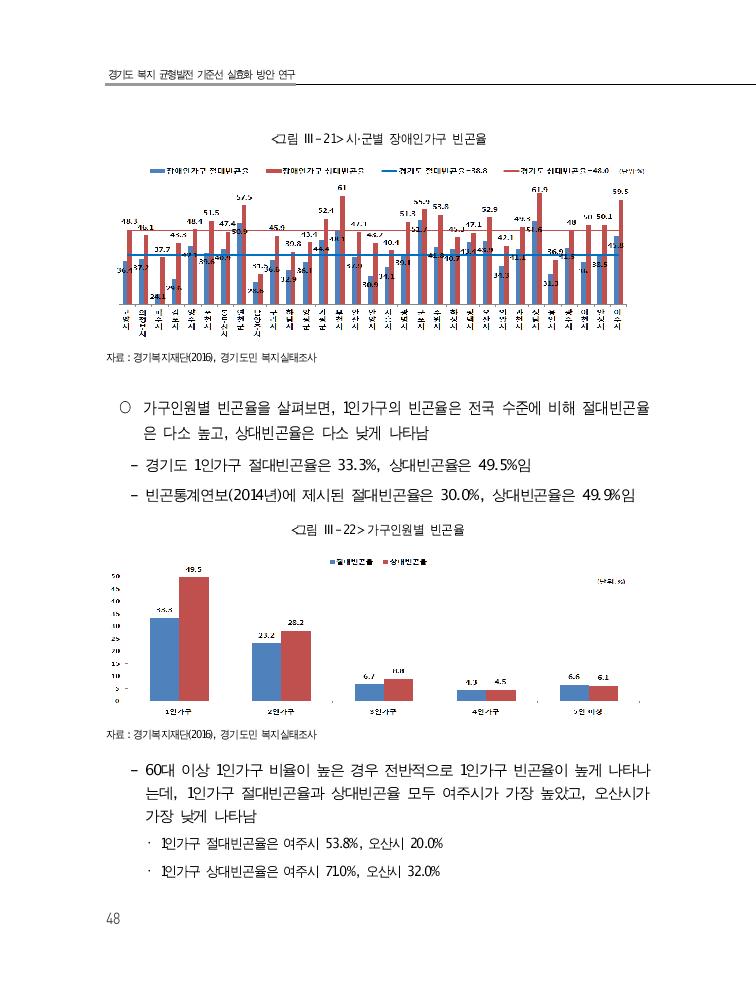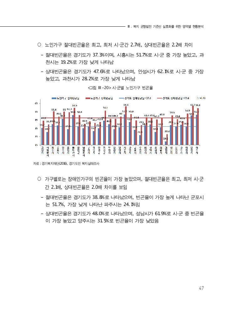 Ⅲ. 복지 균형발전 기준선 실효화를 위한 영역별 현황분석 47 ○ 노인가구 절대빈곤율은 최고, 최저 시·군간 2.7배, 상대빈곤율은 2.2배 차이 - 절대빈곤율은 경기도가 37.3%이며, 시흥시는 51.7%로 시·군 중 가장 높았고, 과 천시는 19.2%로 가장 낮게 나타남 - 상대빈곤율은 경기도가 47.6%로 나타났으며, 안성시가 62.1%로 시·군 중 가장 높았고, 과천시가 28.2%로 가장 낮게 나타남 <그림 Ⅲ-20> 시·군별 노인가구 빈곤율 자료:경기복지재단(2016), 경기도민 복지실태조사 ○ 가구별로는 장애인가구의 빈곤율이 가장 높았으며, 절대빈곤율은 최고, 최저 시·군 간 2.1배, 상대빈곤율은 2.0배 차이를 보임 - 절대빈곤율은 경기도가 38.8%로 나타났으며, 빈곤율이 가장 높게 나타난 군포시 는 51.7%, 가장 낮게 나타난 파주시는 24.1%임 - 상대빈곤율은 경기도가 48.0%로 나타났으며, 성남시가 61.9%로 시·군 중 빈곤율 이 가장 높았고 양주시는 31.5%로 빈곤율이 가장 낮았음