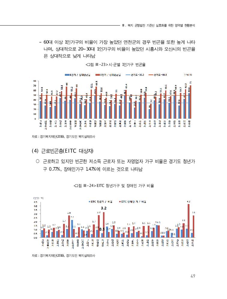 Ⅲ. 복지 균형발전 기준선 실효화를 위한 영역별 현황분석 49 - 60대 이상 1인가구의 비율이 가장 높았던 연천군의 경우 빈곤율 또한 높게 나타 나며, 상대적으로 20~30대 1인가구의 비율이 높았던 시흥시와 오산시의 빈곤율 은 상대적으로 낮게 나타남 <그림 Ⅲ-23> 시·군별 1인가구 빈곤율 자료:경기복지재단(2016), 경기도민 복지실태조사 (4) 근로빈곤층(EITC 대상자) ○ 근로하고 있지만 빈곤한 저소득 근로자 또는 자영업자 가구 비율은 경기도 청년가 구 0.77%, 장애인가구 1.47%에 이르는 것으로 나타남 <그림 Ⅲ-24> EITC 청년가구 및 장애인 가구 비율 자료:경기복지재단(2016), 경기도민 복지실태조사