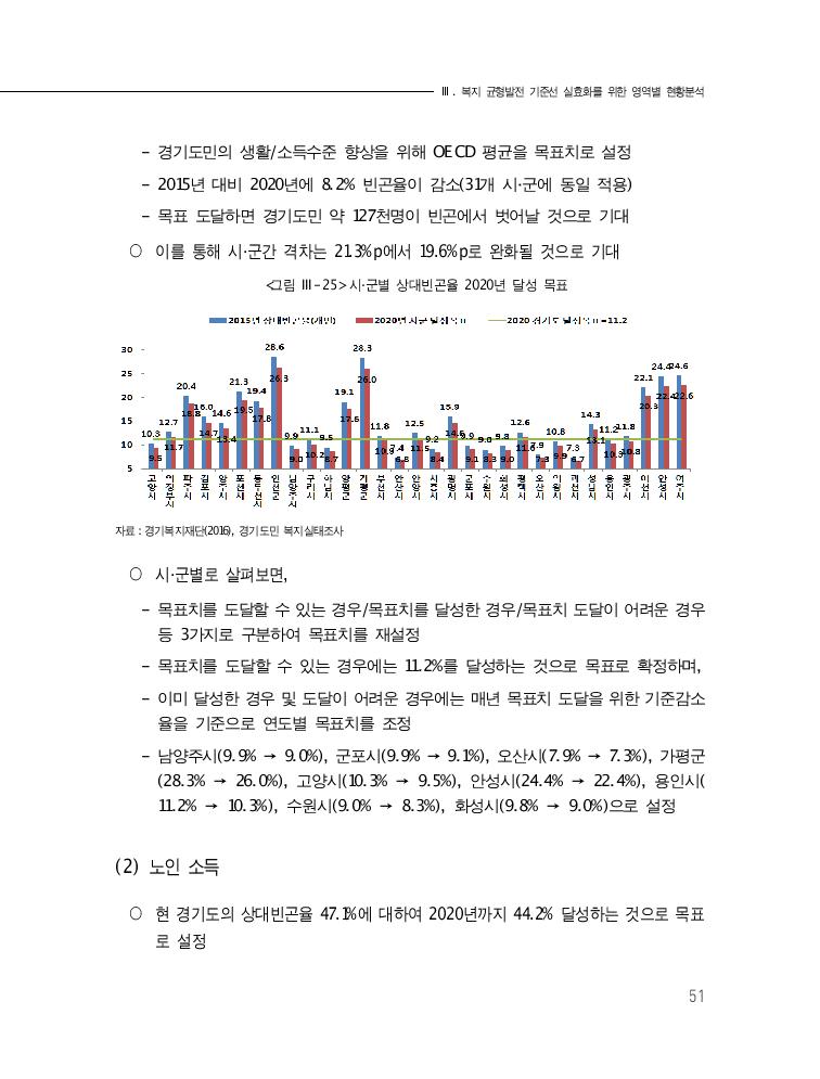 Ⅲ. 복지 균형발전 기준선 실효화를 위한 영역별 현황분석 51 - 경기도민의 생활/소득수준 향상을 위해 OECD 평균을 목표치로 설정 - 2015년 대비 2020년에 8.2% 빈곤율이 감소(31개 시·군에 동일 적용) - 목표 도달하면 경기도민 약 127천명이 빈곤에서 벗어날 것으로 기대 ○ 이를 통해 시·군간 격차는 21.3%p에서 19.6%p로 완화될 것으로 기대 <그림 Ⅲ-25> 시·군별 상대빈곤율 2020년 달성 목표 자료:경기복지재단(2016), 경기도민 복지실태조사 ○ 시·군별로 살펴보면, - 목표치를 도달할 수 있는 경우/목표치를 달성한 경우/목표치 도달이 어려운 경우 등 3가지로 구분하여 목표치를 재설정 - 목표치를 도달할 수 있는 경우에는 11.2%를 달성하는 것으로 목표로 확정하며, - 이미 달성한 경우 및 도달이 어려운 경우에는 매년 목표치 도달을 위한 기준감소 율을 기준으로 연도별 목표치를 조정 - 남양주시(9.9% → 9.0%), 군포시(9.9% → 9.1%), 오산시(7.9% → 7.3%), 가평군 (28.3% → 26.0%), 고양시(10.3% → 9.5%), 안성시(24.4% → 22.4%), 용인시( 11.2% → 10.3%), 수원시(9.0% → 8.3%), 화성시(9.8% → 9.0%)으로 설정 (2) 노인 소득 ○ 현 경기도의 상대빈곤율 47.1%에 대하여 2020년까지 44.2% 달성하는 것으로 목표 로 설정