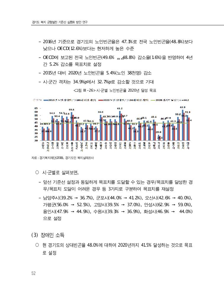 경기도 복지 균형발전 기준선 실효화 방안 연구 52 - 2016년 기준으로 경기도의 노인빈곤율은 47.1%로 전국 노인빈곤율(48.8%)보다 낮으나 OECD(12.6%)보다는 현저하게 높은 수준 - OECD에 보고된 전국 노인빈곤(49.6% 48.8%) 감소율(1.6%)을 반영하여 4년 간 5.2% 감소를 목표치로 설정 - 2015년 대비 2020년 노인빈곤율 5.4%(노인 38천명) 감소 - 시·군간 격차는 34.9%p에서 32.7%p로 감소할 것으로 기대 <그림 Ⅲ-26> 시·군별 노인빈곤율 2020년 달성 목표 자료:경기복지재단(2016), 경기도민 복지실태조사 ○ 시·군별로 살펴보면, - 앞선 기준선 설정과 동일하게 목표치를 도달할 수 있는 경우/목표치를 달성한 경 우/목표치 도달이 어려운 경우 등 3가지로 구분하여 목표치를 재설정 - 남양주시(39.2% → 36.7%), 군포시(44.0% → 41.2%), 오산시(42.6% → 40.0%), 가평군(56.0% → 52.5%), 고양시(39.5% → 37.0%), 안성시(62.9% → 59.0%), 용인시(47.9% → 44.9%), 수원시(39.3% → 36.9%), 화성시(46.9% → 44.0%) 으로 설정 (3) 장애인 소득 ○ 현 경기도의 상대빈곤율 48.0%에 대하여 2020년까지 41.5% 달성하는 것으로 목표 로 설정