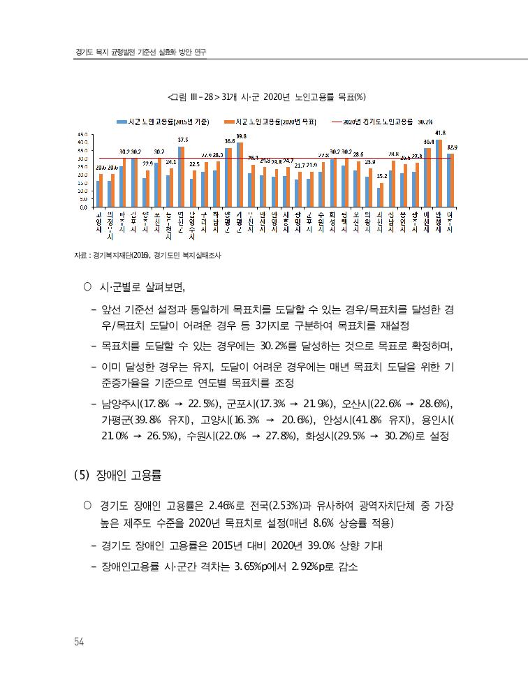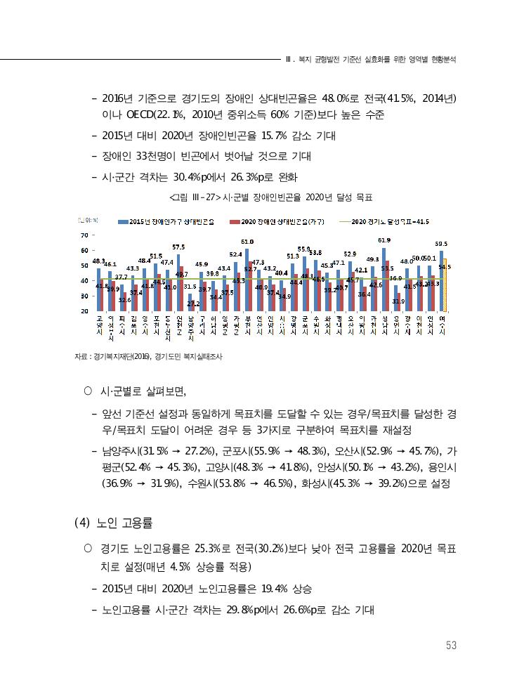 Ⅲ. 복지 균형발전 기준선 실효화를 위한 영역별 현황분석 53 - 2016년 기준으로 경기도의 장애인 상대빈곤율은 48.0%로 전국(41.5%, 2014년) 이나 OECD(22.1%, 2010년 중위소득 60% 기준)보다 높은 수준 - 2015년 대비 2020년 장애인빈곤율 15.7% 감소 기대 - 장애인 33천명이 빈곤에서 벗어날 것으로 기대 - 시·군간 격차는 30.4%p에서 26.3%p로 완화 <그림 Ⅲ-27> 시·군별 장애인빈곤율 2020년 달성 목표 자료:경기복지재단(2016), 경기도민 복지실태조사 ○ 시·군별로 살펴보면, - 앞선 기준선 설정과 동일하게 목표치를 도달할 수 있는 경우/목표치를 달성한 경 우/목표치 도달이 어려운 경우 등 3가지로 구분하여 목표치를 재설정 - 남양주시(31.5% → 27.2%), 군포시(55.9% → 48.3%), 오산시(52.9% → 45.7%), 가 평군(52.4% → 45.3%), 고양시(48.3% → 41.8%), 안성시(50.1% → 43.2%), 용인시 (36.9% → 31.9%), 수원시(53.8% → 46.5%), 화성시(45.3% → 39.2%)으로 설정 (4) 노인 고용률 ○ 경기도 노인고용률은 25.3%로 전국(30.2%)보다 낮아 전국 고용률을 2020년 목표 치로 설정(매년 4.5% 상승률 적용) - 2015년 대비 2020년 노인고용률은 19.4% 상승 - 노인고용률 시·군간 격차는 29.8%p에서 26.6%p로 감소 기대