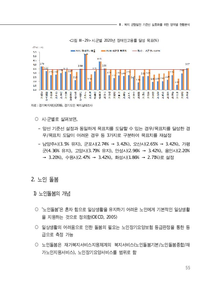 Ⅲ. 복지 균형발전 기준선 실효화를 위한 영역별 현황분석 55 <그림 Ⅲ-29> 시․군별 2020년 장애인고용률 달성 목표(%) 자료:경기복지재단(2016), 경기도민 복지실태조사 ○ 시·군별로 살펴보면, - 앞선 기준선 설정과 동일하게 목표치를 도달할 수 있는 경우/목표치를 달성한 경 우/목표치 도달이 어려운 경우 등 3가지로 구분하여 목표치를 재설정 - 남양주시(3.5% 유지), 군포시(2.74% → 3.42%), 오산시(2.65% → 3.42%), 가평 군(4.36% 유지), 고양시(3.79% 유지), 안성시(2.96% → 3.42%), 용인시(2.20% → 3.20%), 수원시(2.47% → 3.42%), 화성시(1.86% → 2.71%)로 설정 2. 노인 돌봄 1) 노인돌봄의 개념 ○ '노인돌봄'은 혼자 힘으로 일상생활을 유지하기 어려운 노인에게 기본적인 일상생활 을 지원하는 것으로 정의함(OECD, 2005) ○ 일상생활의 어려움으로 인한 돌봄의 필요는 노인장기요양보험 등급판정을 통한 등 급으로 측정 가능 ○ 노인돌봄은 재가복지서비스지원체계의 복지서비스(노인돌봄기본/노인돌봄종합/재 가노인지원서비스), 노인장기요양서비스를 범위로 함