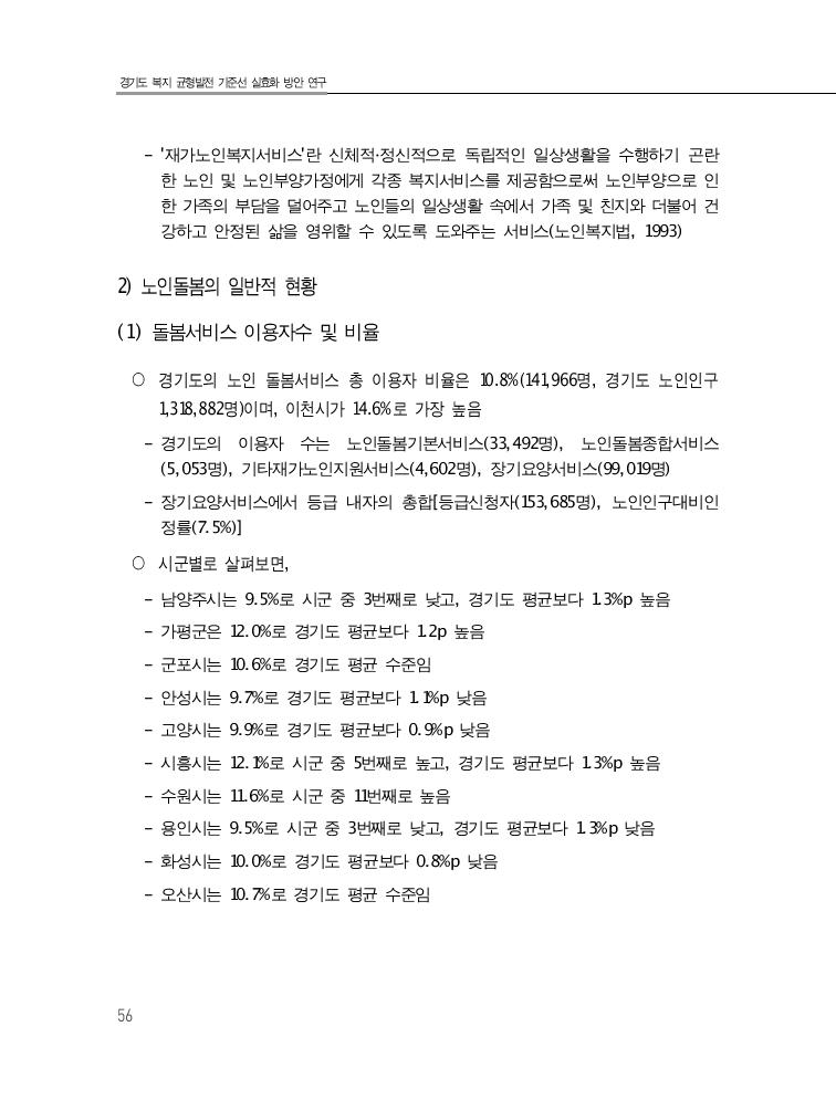경기도 복지 균형발전 기준선 실효화 방안 연구 56 - '재가노인복지서비스'란 신체적·정신적으로 독립적인 일상생활을 수행하기 곤란 한 노인 및 노인부양가정에게 각종 복지서비스를 제공함으로써 노인부양으로 인 한 가족의 부담을 덜어주고 노인들의 일상생활 속에서 가족 및 친지와 더불어 건 강하고 안정된 삶을 영위할 수 있도록 도와주는 서비스(노인복지법, 1993) 2) 노인돌봄의 일반적 현황 (1) 돌봄서비스 이용자수 및 비율 ○ 경기도의 노인 돌봄서비스 총 이용자 비율은 10.8%(141,966명, 경기도 노인인구 1,318,882명)이며, 이천시가 14.6%로 가장 높음 - 경기도의 이용자 수는 노인돌봄기본서비스(33,492명), 노인돌봄종합서비스 (5,053명), 기타재가노인지원서비스(4,602명), 장기요양서비스(99,019명) - 장기요양서비스에서 등급 내자의 총합[등급신청자(153,685명), 노인인구대비인 정률(7.5%)] ○ 시군별로 살펴보면, - 남양주시는 9.5%로 시군 중 3번째로 낮고, 경기도 평균보다 1.3%p 높음 - 가평군은 12.0%로 경기도 평균보다 1.2p 높음 - 군포시는 10.6%로 경기도 평균 수준임 - 안성시는 9.7%로 경기도 평균보다 1.1%p 낮음 - 고양시는 9.9%로 경기도 평균보다 0.9%p 낮음 - 시흥시는 12.1%로 시군 중 5번째로 높고, 경기도 평균보다 1.3%p 높음 - 수원시는 11.6%로 시군 중 11번째로 높음 - 용인시는 9.5%로 시군 중 3번째로 낮고, 경기도 평균보다 1.3%p 낮음 - 화성시는 10.0%로 경기도 평균보다 0.8%p 낮음 - 오산시는 10.7%로 경기도 평균 수준임