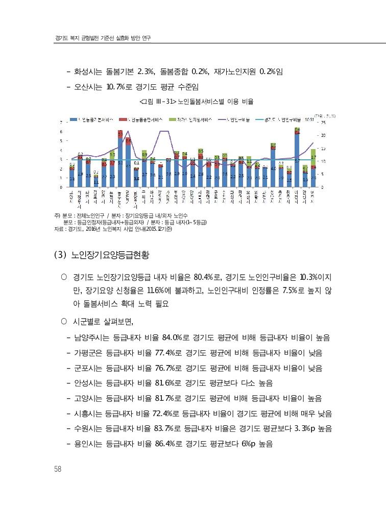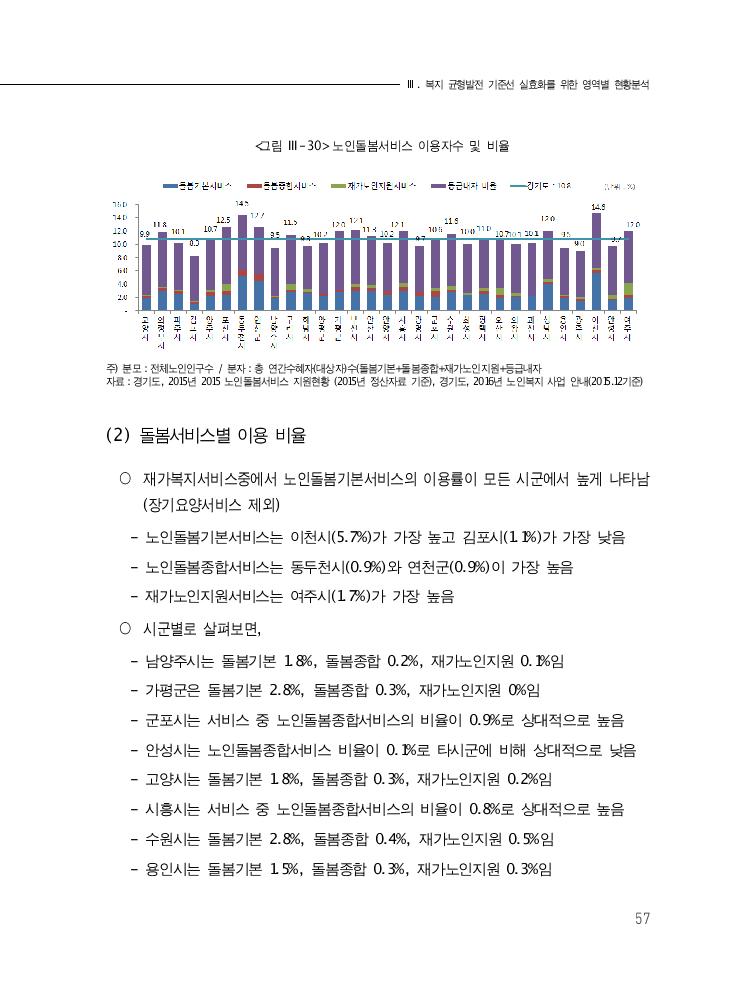 Ⅲ. 복지 균형발전 기준선 실효화를 위한 영역별 현황분석 57 <그림 Ⅲ-30> 노인돌봄서비스 이용자수 및 비율 주) 분모:전체노인인구수 / 분자:총 연간수혜자(대상자)수(돌봄기본+돌봄종합+재가노인지원+등급내자 자료:경기도, 2015년 2015 노인돌봄서비스 지원현황 (2015년 정산자료 기준), 경기도, 2016년 노인복지 사업 안내(2015.12기준) (2) 돌봄서비스별 이용 비율 ○ 재가복지서비스중에서 노인돌봄기본서비스의 이용률이 모든 시군에서 높게 나타남 (장기요양서비스 제외) - 노인돌봄기본서비스는 이천시(5.7%)가 가장 높고 김포시(1.1%)가 가장 낮음 - 노인돌봄종합서비스는 동두천시(0.9%)와 연천군(0.9%)이 가장 높음 - 재가노인지원서비스는 여주시(1.7%)가 가장 높음 ○ 시군별로 살펴보면, - 남양주시는 돌봄기본 1.8%, 돌봄종합 0.2%, 재가노인지원 0.1%임 - 가평군은 돌봄기본 2.8%, 돌봄종합 0.3%, 재가노인지원 0%임 - 군포시는 서비스 중 노인돌봄종합서비스의 비율이 0.9%로 상대적으로 높음 - 안성시는 노인돌봄종합서비스 비율이 0.1%로 타시군에 비해 상대적으로 낮음 - 고양시는 돌봄기본 1.8%, 돌봄종합 0.3%, 재가노인지원 0.2%임 - 시흥시는 서비스 중 노인돌봄종합서비스의 비율이 0.8%로 상대적으로 높음 - 수원시는 돌봄기본 2.8%, 돌봄종합 0.4%, 재가노인지원 0.5%임 - 용인시는 돌봄기본 1.5%, 돌봄종합 0.3%, 재가노인지원 0.3%임