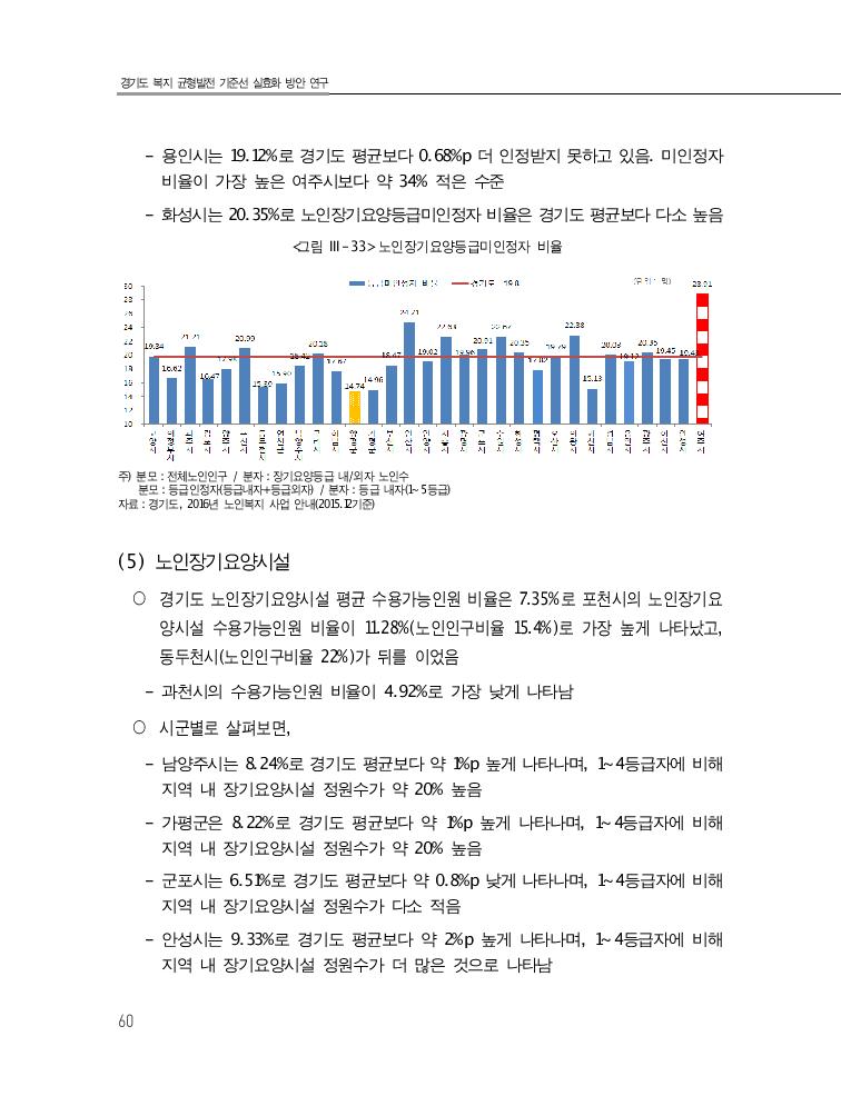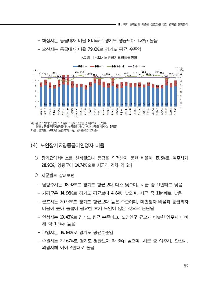 Ⅲ. 복지 균형발전 기준선 실효화를 위한 영역별 현황분석 59 - 화성시는 등급내자 비율 81.6%로 경기도 평균보다 1.2%p 높음 - 오산시는 등급내자 비율 79.0%로 경기도 평균 수준임 <그림 Ⅲ-32> 노인장기요양등급현황 주) 분모:전체노인인구 / 분자:장기요양등급 내/외자 노인수 분모:등급인정자(등급내자+등급외자) / 분자:등급 내자(1~5등급) 자료:경기도, 2016년 노인복지 사업 안내(2015.12기준) (4) 노인장기요양등급미인정자 비율 ○ 장기요양서비스를 신청했으나 등급을 인정받지 못한 비율이 19.8%로 여주시가 28.91%, 양평군이 14.74%으로 시군간 격차 약 2배 ○ 시군별로 살펴보면, - 남양주시는 18.42%로 경기도 평균보다 다소 낮으며, 시군 중 11번째로 낮음 - 가평군은 14.96%로 경기도 평균보다 4.84% 낮으며, 시군 중 11번째로 낮음 - 군포시는 20.91%로 경기도 평균보다 높은 수준이며, 미인정자 비율과 등급외자 비율이 높아 돌봄이 필요한 초기 노인이 많은 것으로 판단됨 - 안성시는 19.43%로 경기도 평균 수준이고, 노인인구 규모가 비슷한 양주시에 비 해 약 1.4%p 높음 - 고양시는 19.84%로 경기도 평균수준임 - 수원시는 22.67%로 경기도 평균보다 약 3%p 높으며, 시군 중 여주시, 안산시, 의왕시에 이어 4번째로 높음