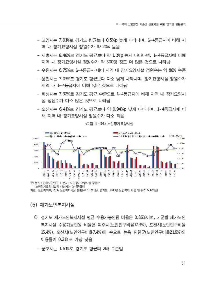Ⅲ. 복지 균형발전 기준선 실효화를 위한 영역별 현황분석 61 - 고양시는 7.91%로 경기도 평균보다 0.5%p 높게 나타나며, 1~4등급자에 비해 지 역 내 장기요양시설 정원수가 약 20% 높음 - 시흥시는 8.48%로 경기도 평균보다 약 1.1%p 높게 나타나며, 1~4등급자에 비해 지역 내 장기요양시설 정원수가 약 300명 정도 더 많은 것으로 나타남 - 수원시는 6.75%로 1~4등급자 대비 지역 내 장기요양시설 정원수는 약 88% 수준 - 용인시는 7.03%로 경기도 평균보다 다소 낮게 나타나며, 장기요양시설 정원수가 지역 내 1~4등급자에 비해 많은 것으로 나타남 - 화성시는 7.32%로 경기도 평균 수준으로 1~4등급자에 비해 지역 내 장기요양시 설 정원수가 다소 많은 것으로 나타남 - 오산시는 6.41%로 경기도 평균보다 약 0.94%p 낮게 나타나며, 1~4등급자에 비 해 지역 내 장기요양시설 정원수가 다소 적음 <그림 Ⅲ-34> 노인장기요양시설 주) 분모:전체노인인구 / 분자:노인장기요양시설 정원수 노인장기요양시설의 대상자는 1~4등급임 자료:보건복지부, 2016 노인복지시설 현황(2015.12기준), 경기도, 2016년 노인복지 사업 안내(2015.12기준) (6) 재가노인복지시설 ○ 경기도 재가노인복지시설 평균 수용가능인원 비율은 0.86%이며, 시군별 재가노인 복지시설 수용가능인원 비율은 여주시(노인인구비율17.3%), 포천시(노인인구비율 15.4%), 오산시(노인인구비율7.4%)의 순으로 높음 연천군(노인인구비율21.9%)의 이용률이 0.21%로 가장 낮음 - 군포시는 1.61%로 경기도 평균의 2배 수준임