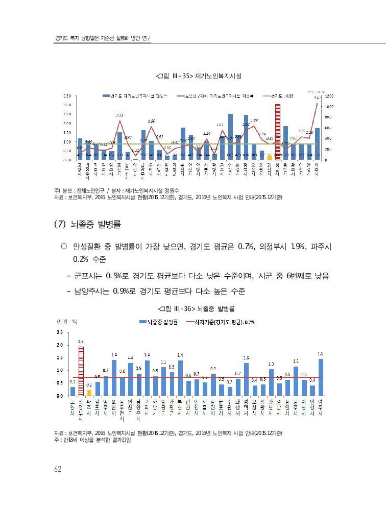 경기도 복지 균형발전 기준선 실효화 방안 연구 62 <그림 Ⅲ-35> 재가노인복지시설 주) 분모:전체노인인구 / 분자:재가노인복지시설 정원수 자료:보건복지부, 2016 노인복지시설 현황(2015.12기준), 경기도, 2016년 노인복지 사업 안내(2015.12기준) (7) 뇌졸중 발병률 ○ 만성질환 중 발병률이 가장 낮으면, 경기도 평균은 0.7%, 의정부시 1.9%, 파주시 0.2% 수준 - 군포시는 0.5%로 경기도 평균보다 다소 낮은 수준이며, 시군 중 6번째로 낮음 - 남양주시는 0.9%로 경기도 평균보다 다소 높은 수준 <그림 Ⅲ-36> 뇌졸중 발병률 자료:보건복지부, 2016 노인복지시설 현황(2015.12기준), 경기도, 2016년 노인복지 사업 안내(2015.12기준) 주:만18세 이상을 분석한 결과값임