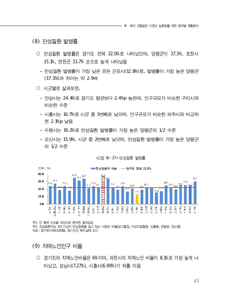Ⅲ. 복지 균형발전 기준선 실효화를 위한 영역별 현황분석 63 (8) 만성질환 발병률 ○ 만성질환 발병률은 경기도 전체 22.0%로 나타났으며, 양평군이 37.3%, 포천시 35.1%, 연천군 33.7% 순으로 높게 나타났음 - 만성질환 발병률이 가장 낮은 곳은 군포시(12.8%)로, 발병률이 가장 높은 양평군 (37.3%)과 차이는 약 2.9배 ○ 시군별로 살펴보면, - 안성시는 24.4%로 경기도 평균보다 2.4%p 높은데, 인구규모가 비슷한 구리시와 비슷한 수준 - 시흥시는 16.7%로 시군 중 3번째로 낮으며, 인구규모가 비슷한 파주시와 비교하 면 2.1%p 낮음 - 수원시는 19.2%로 만성질환 발병률이 가장 높은 양평군의 1/2 수준 - 오산시는 15.9%, 시군 중 2번째로 낮으며, 만성질환 발병률이 가장 높은 양평군 의 1/2 수준 <그림 Ⅲ-37> 만성질환 발병률 주1:만 18세 이상을 대상으로 분석한 결과값임 주2:만성질환자는 1개 이상의 만성질환을 앓고 있는 사람의 비율임(고혈압, 이상지질혈증, 뇌졸중, 관절염, 당뇨병) 자료:경기복지재단(2016), 경기도민 복지실태 조사 (9) 치매노인인구 비율 ○ 경기도의 치매노인비율은 6%이며, 과천시의 치매노인 비율이 8.1%로 가장 높게 나 타났고, 성남시(7.27%), 시흥시(6.99%)가 뒤를 이음