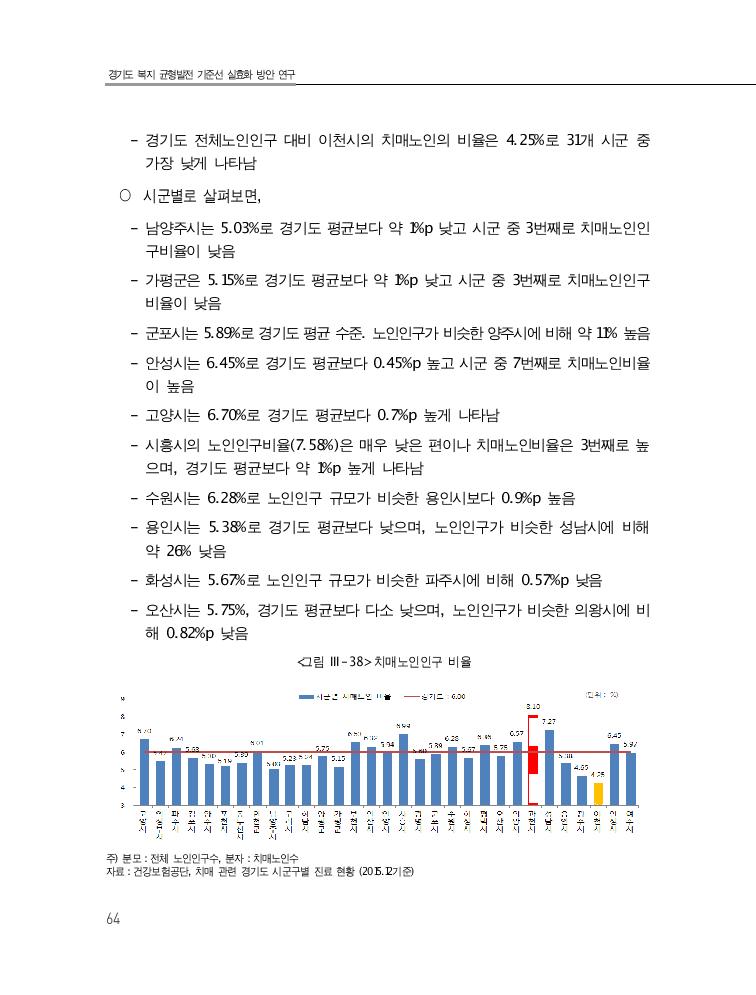 경기도 복지 균형발전 기준선 실효화 방안 연구 64 - 경기도 전체노인인구 대비 이천시의 치매노인의 비율은 4.25%로 31개 시군 중 가장 낮게 나타남 ○ 시군별로 살펴보면, - 남양주시는 5.03%로 경기도 평균보다 약 1%p 낮고 시군 중 3번째로 치매노인인 구비율이 낮음 - 가평군은 5.15%로 경기도 평균보다 약 1%p 낮고 시군 중 3번째로 치매노인인구 비율이 낮음 - 군포시는 5.89%로 경기도 평균 수준. 노인인구가 비슷한 양주시에 비해 약 11% 높음 - 안성시는 6.45%로 경기도 평균보다 0.45%p 높고 시군 중 7번째로 치매노인비율 이 높음 - 고양시는 6.70%로 경기도 평균보다 0.7%p 높게 나타남 - 시흥시의 노인인구비율(7.58%)은 매우 낮은 편이나 치매노인비율은 3번째로 높 으며, 경기도 평균보다 약 1%p 높게 나타남 - 수원시는 6.28%로 노인인구 규모가 비슷한 용인시보다 0.9%p 높음 - 용인시는 5.38%로 경기도 평균보다 낮으며, 노인인구가 비슷한 성남시에 비해 약 26% 낮음 - 화성시는 5.67%로 노인인구 규모가 비슷한 파주시에 비해 0.57%p 낮음 - 오산시는 5.75%, 경기도 평균보다 다소 낮으며, 노인인구가 비슷한 의왕시에 비 해 0.82%p 낮음 <그림 Ⅲ-38> 치매노인인구 비율 주) 분모:전체 노인인구수, 분자:치매노인수 자료:건강보험공단, 치매 관련 경기도 시군구별 진료 현황 (2015.12기준)