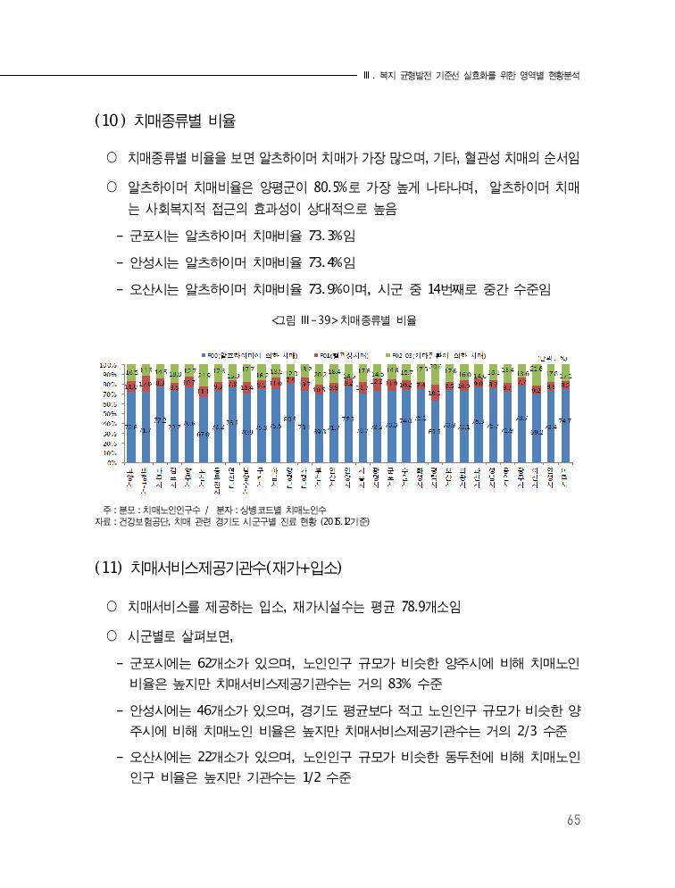 Ⅲ. 복지 균형발전 기준선 실효화를 위한 영역별 현황분석 65 (10) 치매종류별 비율 ○ 치매종류별 비율을 보면 알츠하이머 치매가 가장 많으며, 기타, 혈관성 치매의 순서임 ○ 알츠하이머 치매비율은 양평군이 80.5%로 가장 높게 나타나며, 알츠하이머 치매 는 사회복지적 접근의 효과성이 상대적으로 높음 - 군포시는 알츠하이머 치매비율 73.3%임 - 안성시는 알츠하이머 치매비율 73.4%임 - 오산시는 알츠하이머 치매비율 73.9%이며, 시군 중 14번째로 중간 수준임 <그림 Ⅲ-39> 치매종류별 비율 주:분모:치매노인인구수 / 분자:상병코드별 치매노인수 자료:건강보험공단, 치매 관련 경기도 시군구별 진료 현황 (2015.12기준) (11) 치매서비스제공기관수(재가+입소) ○ 치매서비스를 제공하는 입소, 재가시설수는 평균 78.9개소임 ○ 시군별로 살펴보면, - 군포시에는 62개소가 있으며, 노인인구 규모가 비슷한 양주시에 비해 치매노인 비율은 높지만 치매서비스제공기관수는 거의 83% 수준 - 안성시에는 46개소가 있으며, 경기도 평균보다 적고 노인인구 규모가 비슷한 양 주시에 비해 치매노인 비율은 높지만 치매서비스제공기관수는 거의 2/3 수준 - 오산시에는 22개소가 있으며, 노인인구 규모가 비슷한 동두천에 비해 치매노인 인구 비율은 높지만 기관수는 1/2 수준