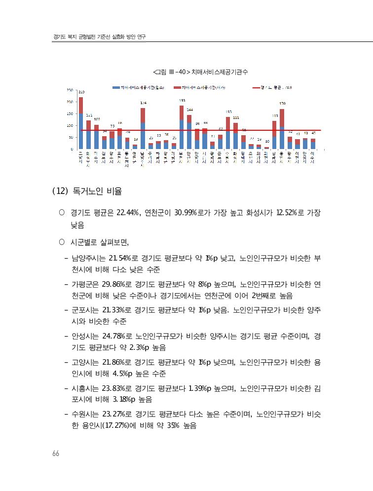 경기도 복지 균형발전 기준선 실효화 방안 연구 66 <그림 Ⅲ-40> 치매서비스제공기관수 (12) 독거노인 비율 ○ 경기도 평균은 22.44%, 연천군이 30.99%로가 가장 높고 화성시가 12.52%로 가장 낮음 ○ 시군별로 살펴보면, - 남양주시는 21.54%로 경기도 평균보다 약 1%p 낮고, 노인인구규모가 비슷한 부 천시에 비해 다소 낮은 수준 - 가평군은 29.86%로 경기도 평균보다 약 8%p 높으며, 노인인구규모가 비슷한 연 천군에 비해 낮은 수준이나 경기도에서는 연천군에 이어 2번째로 높음 - 군포시는 21.33%로 경기도 평균보다 약 1%p 낮음. 노인인구규모가 비슷한 양주 시와 비슷한 수준 - 안성시는 24.78%로 노인인구규모가 비슷한 양주시는 경기도 평균 수준이며, 경 기도 평균보다 약 2.3%p 높음 - 고양시는 21.86%로 경기도 평균보다 약 1%p 낮으며, 노인인구규모가 비슷한 용 인시에 비해 4.5%p 높은 수준 - 시흥시는 23.83%로 경기도 평균보다 1.39%p 높으며, 노인인구규모가 비슷한 김 포시에 비해 3.18%p 높음 - 수원시는 23.27%로 경기도 평균보다 다소 높은 수준이며, 노인인구규모가 비슷 한 용인시(17.27%)에 비해 약 35% 높음