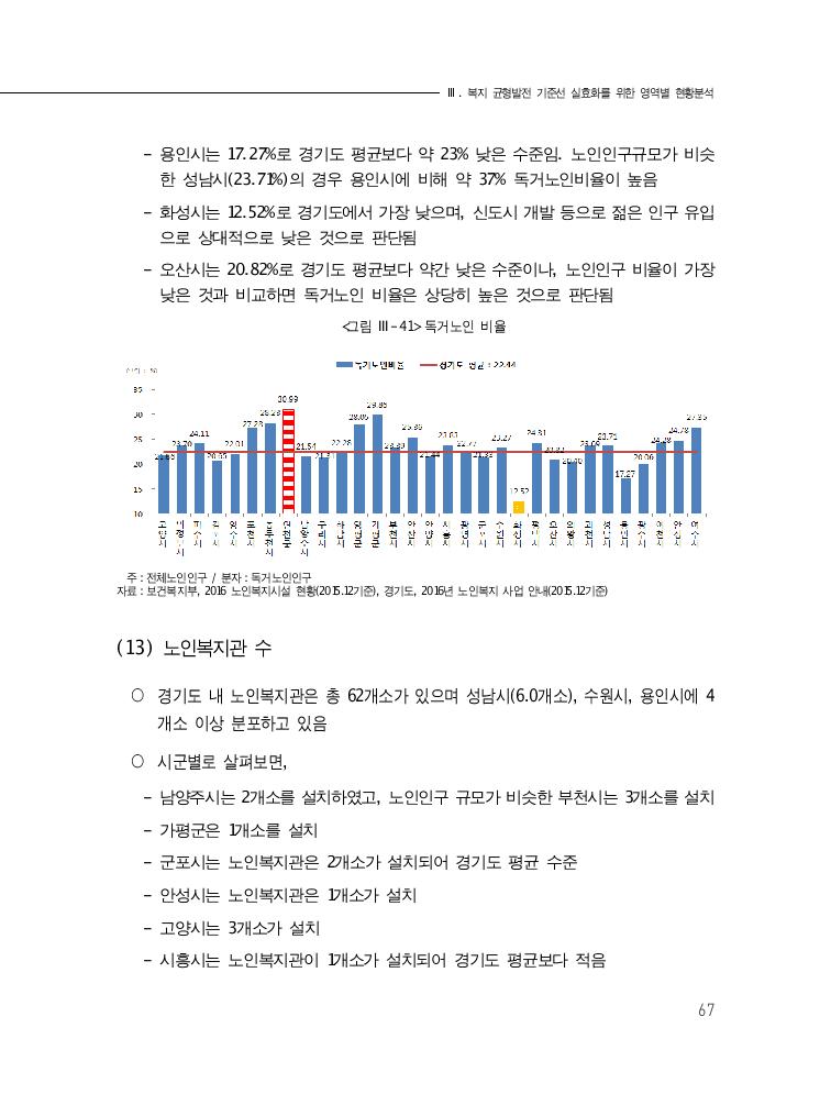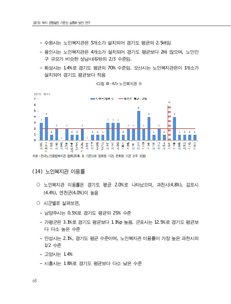 Ⅲ. 복지 균형발전 기준선 실효화를 위한 영역별 현황분석 67 - 용인시는 17.27%로 경기도 평균보다 약 23% 낮은 수준임. 노인인구규모가 비슷 한 성남시(23.71%)의 경우 용인시에 비해 약 37% 독거노인비율이 높음 - 화성시는 12.52%로 경기도에서 가장 낮으며, 신도시 개발 등으로 젊은 인구 유입 으로 상대적으로 낮은 것으로 판단됨 - 오산시는 20.82%로 경기도 평균보다 약간 낮은 수준이나, 노인인구 비율이 가장 낮은 것과 비교하면 독거노인 비율은 상당히 높은 것으로 판단됨 <그림 Ⅲ-41> 독거노인 비율 주:전체노인인구 / 분자:독거노인인구 자료:보건복지부, 2016 노인복지시설 현황(2015.12기준), 경기도, 2016년 노인복지 사업 안내(2015.12기준) (13) 노인복지관 수 ○ 경기도 내 노인복지관은 총 62개소가 있으며 성남시(6.0개소), 수원시, 용인시에 4 개소 이상 분포하고 있음 ○ 시군별로 살펴보면, - 남양주시는 2개소를 설치하였고, 노인인구 규모가 비슷한 부천시는 3개소를 설치 - 가평군은 1개소를 설치 - 군포시는 노인복지관은 2개소가 설치되어 경기도 평균 수준 - 안성시는 노인복지관은 1개소가 설치 - 고양시는 3개소가 설치 - 시흥시는 노인복지관이 1개소가 설치되어 경기도 평균보다 적음