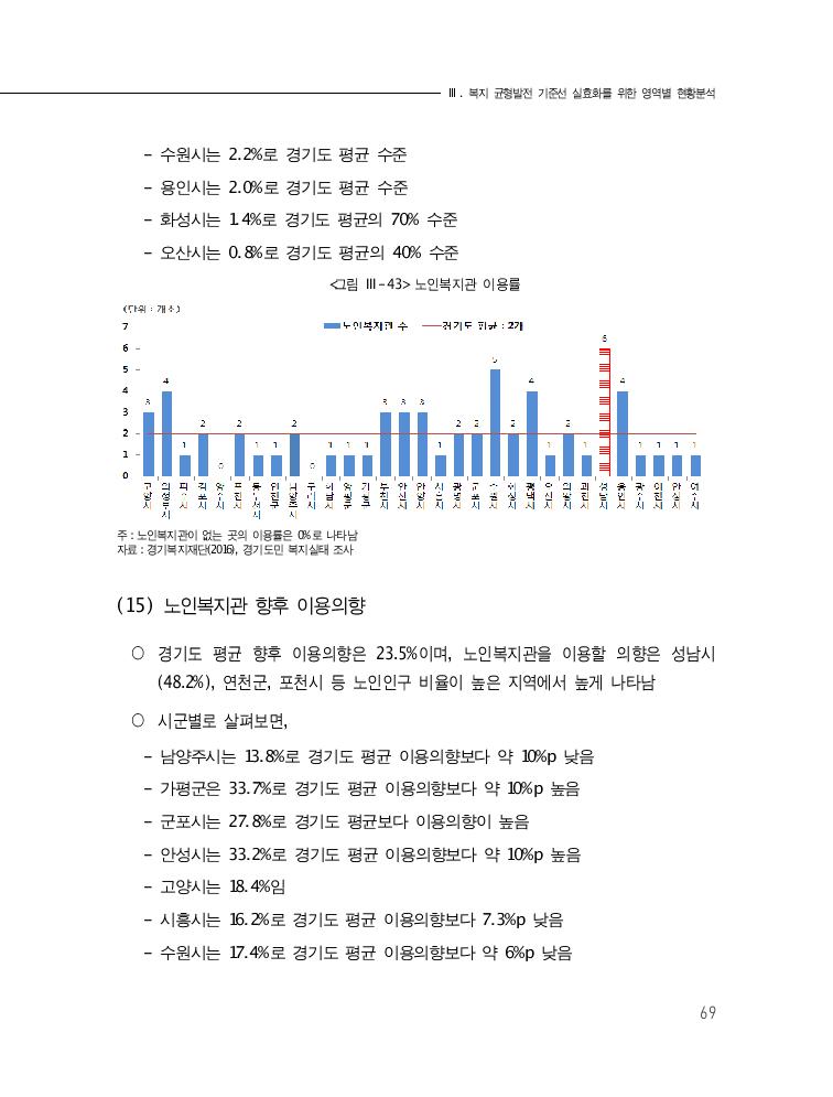 Ⅲ. 복지 균형발전 기준선 실효화를 위한 영역별 현황분석 69 - 수원시는 2.2%로 경기도 평균 수준 - 용인시는 2.0%로 경기도 평균 수준 - 화성시는 1.4%로 경기도 평균의 70% 수준 - 오산시는 0.8%로 경기도 평균의 40% 수준 <그림 Ⅲ-43> 노인복지관 이용률 주:노인복지관이 없는 곳의 이용률은 0%로 나타남 자료:경기복지재단(2016), 경기도민 복지실태 조사 (15) 노인복지관 향후 이용의향 ○ 경기도 평균 향후 이용의향은 23.5%이며, 노인복지관을 이용할 의향은 성남시 (48.2%), 연천군, 포천시 등 노인인구 비율이 높은 지역에서 높게 나타남 ○ 시군별로 살펴보면, - 남양주시는 13.8%로 경기도 평균 이용의향보다 약 10%p 낮음 - 가평군은 33.7%로 경기도 평균 이용의향보다 약 10%p 높음 - 군포시는 27.8%로 경기도 평균보다 이용의향이 높음 - 안성시는 33.2%로 경기도 평균 이용의향보다 약 10%p 높음 - 고양시는 18.4%임 - 시흥시는 16.2%로 경기도 평균 이용의향보다 7.3%p 낮음 - 수원시는 17.4%로 경기도 평균 이용의향보다 약 6%p 낮음