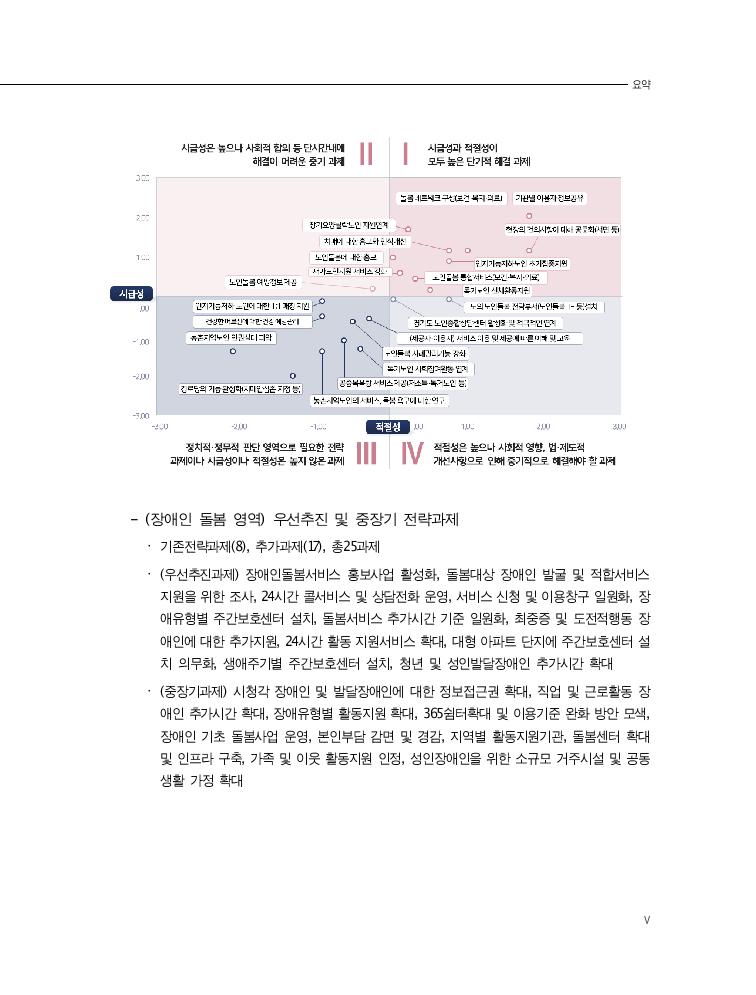 요약 v - (장애인 돌봄 영역) 우선추진 및 중장기 전략과제 ・ 기존전략과제(8), 추가과제(17), 총25과제 ・ (우선추진과제) 장애인돌봄서비스 홍보사업 활성화, 돌봄대상 장애인 발굴 및 적합서비스 지원을 위한 조사, 24시간 콜서비스 및 상담전화 운영, 서비스 신청 및 이용창구 일원화, 장 애유형별 주간보호센터 설치, 돌봄서비스 추가시간 기준 일원화, 최중증 및 도전적행동 장 애인에 대한 추가지원, 24시간 활동 지원서비스 확대, 대형 아파트 단지에 주간보호센터 설 치 의무화, 생애주기별 주간보호센터 설치, 청년 및 성인발달장애인 추가시간 확대 ・ (중장기과제) 시청각 장애인 및 발달장애인에 대한 정보접근권 확대, 직업 및 근로활동 장 애인 추가시간 확대, 장애유형별 활동지원 확대, 365쉼터확대 및 이용기준 완화 방안 모색, 장애인 기초 돌봄사업 운영, 본인부담 감면 및 경감, 지역별 활동지원기관, 돌봄센터 확대 및 인프라 구축, 가족 및 이웃 활동지원 인정, 성인장애인을 위한 소규모 거주시설 및 공동 생활 가정 확대