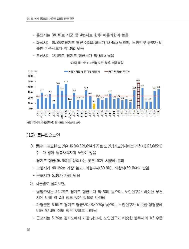 경기도 복지 균형발전 기준선 실효화 방안 연구 70 - 용인시는 38.1%로 시군 중 4번째로 향후 이용의향이 높음 - 화성시는 19.3%로경기도 평균 이용의향보다 약 4%p 낮으며, 노인인구 규모가 비 슷한 파주시보다 약 1%p 낮음 - 오산시는 17.6%로 경기도 평균보다 약 6%p 낮음 <그림 Ⅲ-44> 노인복지관 향후 이용의향 자료:경기복지재단(2016), 경기도민 복지실태 조사 (16) 돌봄필요노인 ○ 돌봄이 필요한 노인은 16.6%(259,694가구)로 노인장기요양서비스 신청자(153,685명) 수보다 많아 돌봄사각지대 노인이 많음 - 경기도 평균(16.6%)을 상회하는 곳은 10개 시군에 불과 - 고양시가 40.4%로 가장 높고, 의정부시(39.9%), 의왕시(39.1%)의 순임 - 군포시가 5.1%가 가장 낮음 ○ 시군별로 살펴보면, - 남양주시는 24.2%로 경기도 평균보다 약 50% 높으며, 노인인구가 비슷한 부천 시에 비해 약 2배 정도 많은 것으로 나타남 - 가평군은 6.6%로 경기도 평균보다 약 10%p 낮으며, 노인인구가 비슷한 양평군에 비해 약 3배 정도 적은 것으로 나타남 - 군포시는 5.1%로 경기도에서 가장 낮으며, 노인인구가 비슷한 양주시의 1/3 수준