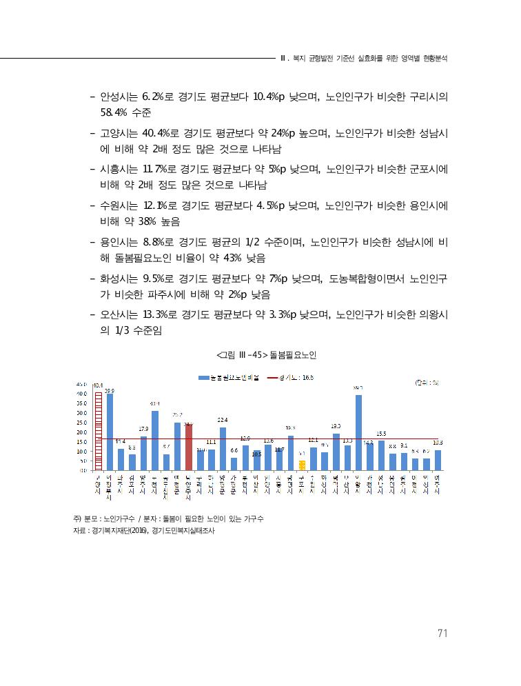 Ⅲ. 복지 균형발전 기준선 실효화를 위한 영역별 현황분석 71 - 안성시는 6.2%로 경기도 평균보다 10.4%p 낮으며, 노인인구가 비슷한 구리시의 58.4% 수준 - 고양시는 40.4%로 경기도 평균보다 약 24%p 높으며, 노인인구가 비슷한 성남시 에 비해 약 2배 정도 많은 것으로 나타남 - 시흥시는 11.7%로 경기도 평균보다 약 5%p 낮으며, 노인인구가 비슷한 군포시에 비해 약 2배 정도 많은 것으로 나타남 - 수원시는 12.1%로 경기도 평균보다 4.5%p 낮으며, 노인인구가 비슷한 용인시에 비해 약 38% 높음 - 용인시는 8.8%로 경기도 평균의 1/2 수준이며, 노인인구가 비슷한 성남시에 비 해 돌봄필요노인 비율이 약 43% 낮음 - 화성시는 9.5%로 경기도 평균보다 약 7%p 낮으며, 도농복합형이면서 노인인구 가 비슷한 파주시에 비해 약 2%p 낮음 - 오산시는 13.3%로 경기도 평균보다 약 3.3%p 낮으며, 노인인구가 비슷한 의왕시 의 1/3 수준임 <그림 Ⅲ-45> 돌봄필요노인 주) 분모:노인가구수 / 분자:돌봄이 필요한 노인이 있는 가구수 자료:경기복지재단(2016), 경기도민복지실태조사