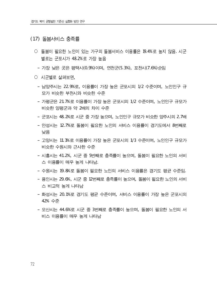 경기도 복지 균형발전 기준선 실효화 방안 연구 72 (17) 돌봄서비스 충족률 ○ 돌봄이 필요한 노인이 있는 가구의 돌봄서비스 이용률은 19.4%로 높지 않음. 시군 별로는 군포시가 48.2%로 가장 높음 - 가장 낮은 곳은 평택시(0.9%)이며, 연천군(5.3%), 포천시(7.6%)순임 ○ 시군별로 살펴보면, - 남양주시는 22.9%로, 이용률이 가장 높은 군포시의 1/2 수준이며, 노인인구 규 모가 비슷한 부천시와 비슷한 수준 - 가평군은 21.7%로 이용률이 가장 높은 군포시의 1/2 수준이며, 노인인구 규모가 비슷한 양평군과 약 2배의 차이 수준 - 군포시는 48.2%로 시군 중 가장 높으며, 노인인구 규모가 비슷한 양주시의 2.7배 - 안성시는 12.7%로 돌봄이 필요한 노인의 서비스 이용률이 경기도에서 8번째로 낮음 - 고양시는 11.3%로 이용률이 가장 높은 군포시의 1/3 수준이며, 노인인구 규모가 비슷한 수원시와 근사한 수준 - 시흥시는 41.2%, 시군 중 5번째로 충족률이 높으며, 돌봄이 필요한 노인의 서비 스 이용률이 매우 높게 나타남. - 수원시는 19.8%로 돌봄이 필요한 노인의 서비스 이용률은 경기도 평균 수준임. - 용인시는 29.6%, 시군 중 12번째로 충족률이 높으며, 돌봄이 필요한 노인의 서비 스 비교적 높게 나타남 - 화성시는 20.1%로 경기도 평균 수준이며, 서비스 이용률이 가장 높은 군포시의 42% 수준 - 오산시는 44.6%로 시군 중 3번째로 충족률이 높으며, 돌봄이 필요한 노인의 서 비스 이용률이 매우 높게 나타남