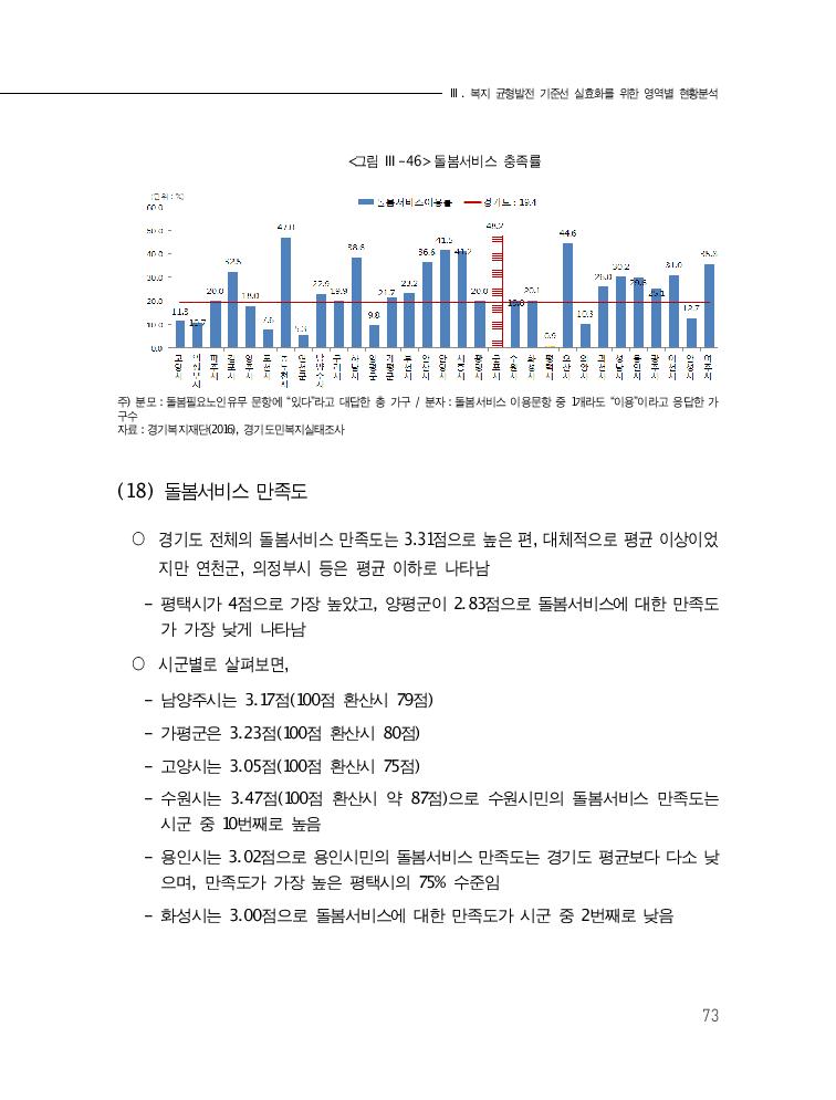Ⅲ. 복지 균형발전 기준선 실효화를 위한 영역별 현황분석 73 <그림 Ⅲ-46> 돌봄서비스 충족률 주) 분모:돌봄필요노인유무 문항에 “있다”라고 대답한 총 가구 / 분자:돌봄서비스 이용문항 중 1개라도 “이용”이라고 응답한 가 구수 자료:경기복지재단(2016), 경기도민복지실태조사 (18) 돌봄서비스 만족도 ○ 경기도 전체의 돌봄서비스 만족도는 3.31점으로 높은 편, 대체적으로 평균 이상이었 지만 연천군, 의정부시 등은 평균 이하로 나타남 - 평택시가 4점으로 가장 높았고, 양평군이 2.83점으로 돌봄서비스에 대한 만족도 가 가장 낮게 나타남 ○ 시군별로 살펴보면, - 남양주시는 3.17점(100점 환산시 79점) - 가평군은 3.23점(100점 환산시 80점) - 고양시는 3.05점(100점 환산시 75점) - 수원시는 3.47점(100점 환산시 약 87점)으로 수원시민의 돌봄서비스 만족도는 시군 중 10번째로 높음 - 용인시는 3.02점으로 용인시민의 돌봄서비스 만족도는 경기도 평균보다 다소 낮 으며, 만족도가 가장 높은 평택시의 75% 수준임 - 화성시는 3.00점으로 돌봄서비스에 대한 만족도가 시군 중 2번째로 낮음