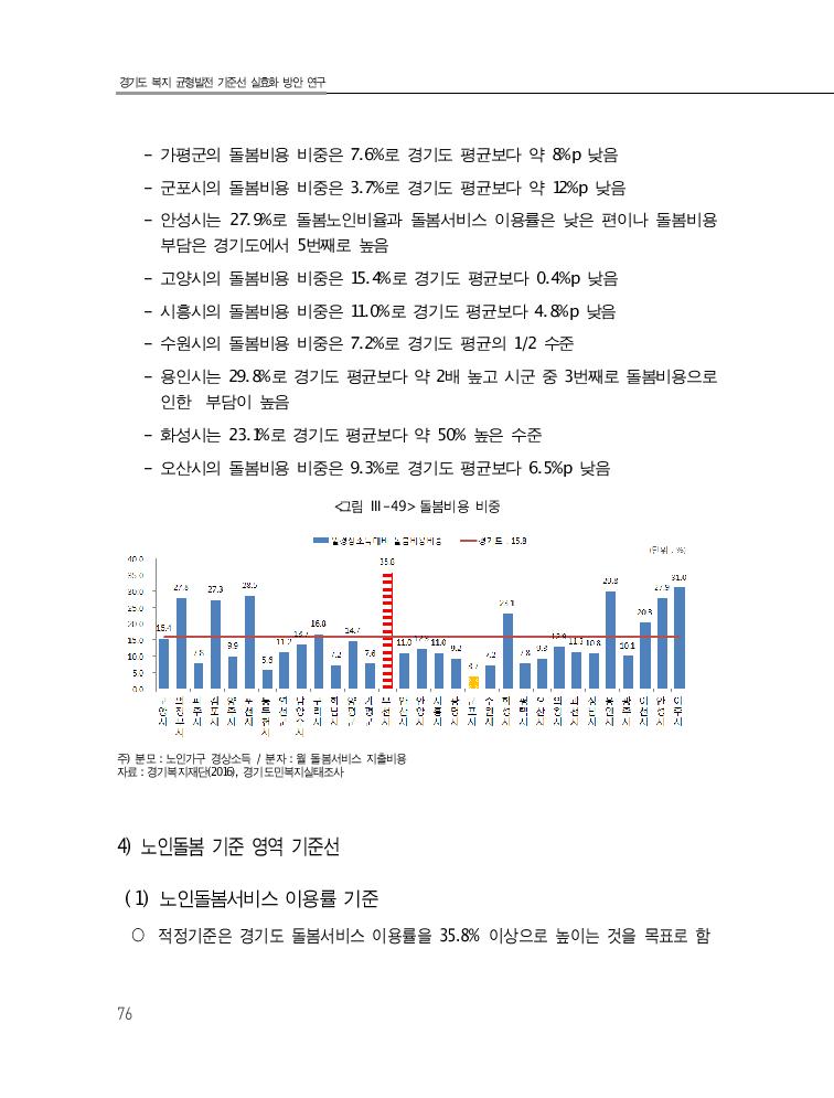 경기도 복지 균형발전 기준선 실효화 방안 연구 76 - 가평군의 돌봄비용 비중은 7.6%로 경기도 평균보다 약 8%p 낮음 - 군포시의 돌봄비용 비중은 3.7%로 경기도 평균보다 약 12%p 낮음 - 안성시는 27.9%로 돌봄노인비율과 돌봄서비스 이용률은 낮은 편이나 돌봄비용 부담은 경기도에서 5번째로 높음 - 고양시의 돌봄비용 비중은 15.4%로 경기도 평균보다 0.4%p 낮음 - 시흥시의 돌봄비용 비중은 11.0%로 경기도 평균보다 4.8%p 낮음 - 수원시의 돌봄비용 비중은 7.2%로 경기도 평균의 1/2 수준 - 용인시는 29.8%로 경기도 평균보다 약 2배 높고 시군 중 3번째로 돌봄비용으로 인한 부담이 높음 - 화성시는 23.1%로 경기도 평균보다 약 50% 높은 수준 - 오산시의 돌봄비용 비중은 9.3%로 경기도 평균보다 6.5%p 낮음 <그림 Ⅲ-49> 돌봄비용 비중 주) 분모:노인가구 경상소득 / 분자:월 돌봄서비스 지출비용 자료:경기복지재단(2016), 경기도민복지실태조사 4) 노인돌봄 기준 영역 기준선 (1) 노인돌봄서비스 이용률 기준 ○ 적정기준은 경기도 돌봄서비스 이용률을 35.8% 이상으로 높이는 것을 목표로 함