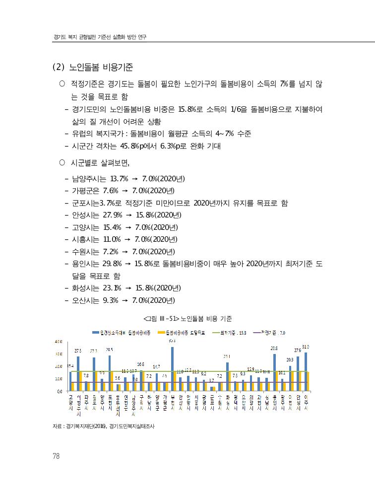 경기도 복지 균형발전 기준선 실효화 방안 연구 78 (2) 노인돌봄 비용기준 ○ 적정기준은 경기도는 돌봄이 필요한 노인가구의 돌봄비용이 소득의 7%를 넘지 않 는 것을 목표로 함 - 경기도민의 노인돌봄비용 비중은 15.8%로 소득의 1/6을 돌봄비용으로 지불하여 삶의 질 개선이 어려운 상황 - 유럽의 복지국가:돌봄비용이 월평균 소득의 4~7% 수준 - 시군간 격차는 45.8%p에서 6.3%p로 완화 기대 ○ 시군별로 살펴보면, - 남양주시는 13.7% → 7.0%(2020년) - 가평군은 7.6% → 7.0%(2020년) - 군포시는3.7%로 적정기준 미만이므로 2020년까지 유지를 목표로 함 - 안성시는 27.9% → 15.8%(2020년) - 고양시는 15.4% → 7.0%(2020년) - 시흥시는 11.0% → 7.0%(2020년) - 수원시는 7.2% → 7.0%(2020년) - 용인시는 29.8% → 15.8%로 돌봄비용비중이 매우 높아 2020년까지 최저기준 도 달을 목표로 함 - 화성시는 23.1% → 15.8%(2020년) - 오산시는 9.3% → 7.0%(2020년) <그림 Ⅲ-51> 노인돌봄 비용 기준 자료:경기복지재단(2016), 경기도민복지실태조사