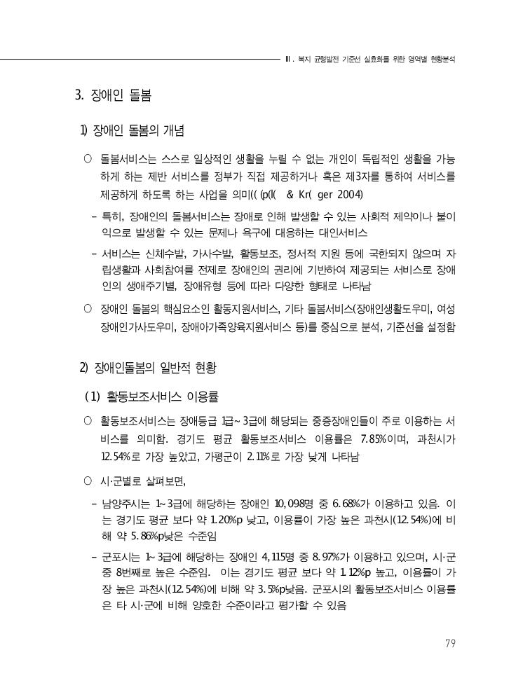 Ⅲ. 복지 균형발전 기준선 실효화를 위한 영역별 현황분석 79 3. 장애인 돌봄 1) 장애인 돌봄의 개념 ○ 돌봄서비스는 스스로 일상적인 생활을 누릴 수 없는 개인이 독립적인 생활을 가능 하게 하는 제반 서비스를 정부가 직접 제공하거나 혹은 제3자를 통하여 서비스를 제공하게 하도록 하는 사업을 의미(((p(l( & Kr(ger 2004) - 특히, 장애인의 돌봄서비스는 장애로 인해 발생할 수 있는 사회적 제약이나 불이 익으로 발생할 수 있는 문제나 욕구에 대응하는 대인서비스 - 서비스는 신체수발, 가사수발, 활동보조, 정서적 지원 등에 국한되지 않으며 자 립생활과 사회참여를 전제로 장애인의 권리에 기반하여 제공되는 서비스로 장애 인의 생애주기별, 장애유형 등에 따라 다양한 형태로 나타남 ○ 장애인 돌봄의 핵심요소인 활동지원서비스, 기타 돌봄서비스(장애인생활도우미, 여성 장애인가사도우미, 장애아가족양육지원서비스 등)를 중심으로 분석, 기준선을 설정함 2) 장애인돌봄의 일반적 현황 (1) 활동보조서비스 이용률 ○ 활동보조서비스는 장애등급 1급~3급에 해당되는 중증장애인들이 주로 이용하는 서 비스를 의미함. 경기도 평균 활동보조서비스 이용률은 7.85%이며, 과천시가 12.54%로 가장 높았고, 가평군이 2.11%로 가장 낮게 나타남 ○ 시·군별로 살펴보면, - 남양주시는 1~3급에 해당하는 장애인 10,098명 중 6.68%가 이용하고 있음. 이 는 경기도 평균 보다 약 1.20%p 낮고, 이용률이 가장 높은 과천시(12.54%)에 비 해 약 5.86%p낮은 수준임 - 군포시는 1~3급에 해당하는 장애인 4,115명 중 8.97%가 이용하고 있으며, 시·군 중 8번째로 높은 수준임. 이는 경기도 평균 보다 약 1.12%p 높고, 이용률이 가 장 높은 과천시(12.54%)에 비해 약 3.5%p낮음. 군포시의 활동보조서비스 이용률 은 타 시·군에 비해 양호한 수준이라고 평가할 수 있음